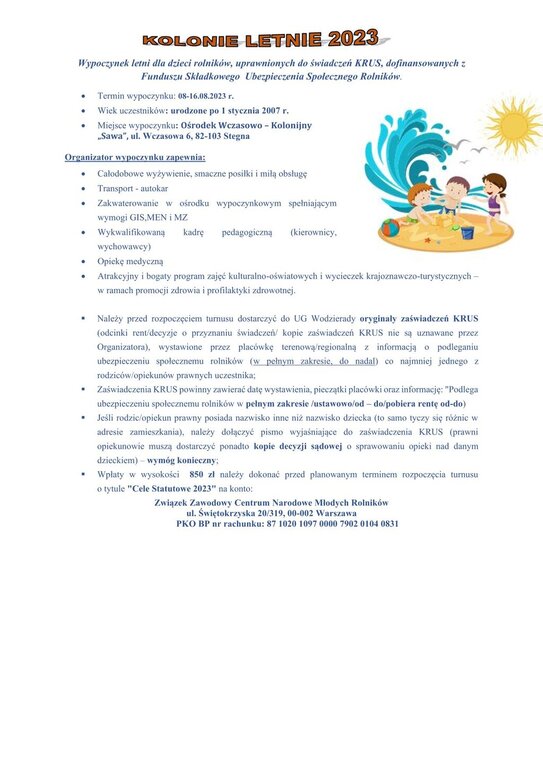 Wypoczynek letni dla dzieci rolników, uprawnionych do świadczeń KRUS, dofinansowanych z Funduszu Składkowego Ubezpieczenia Społecznego Rolników.